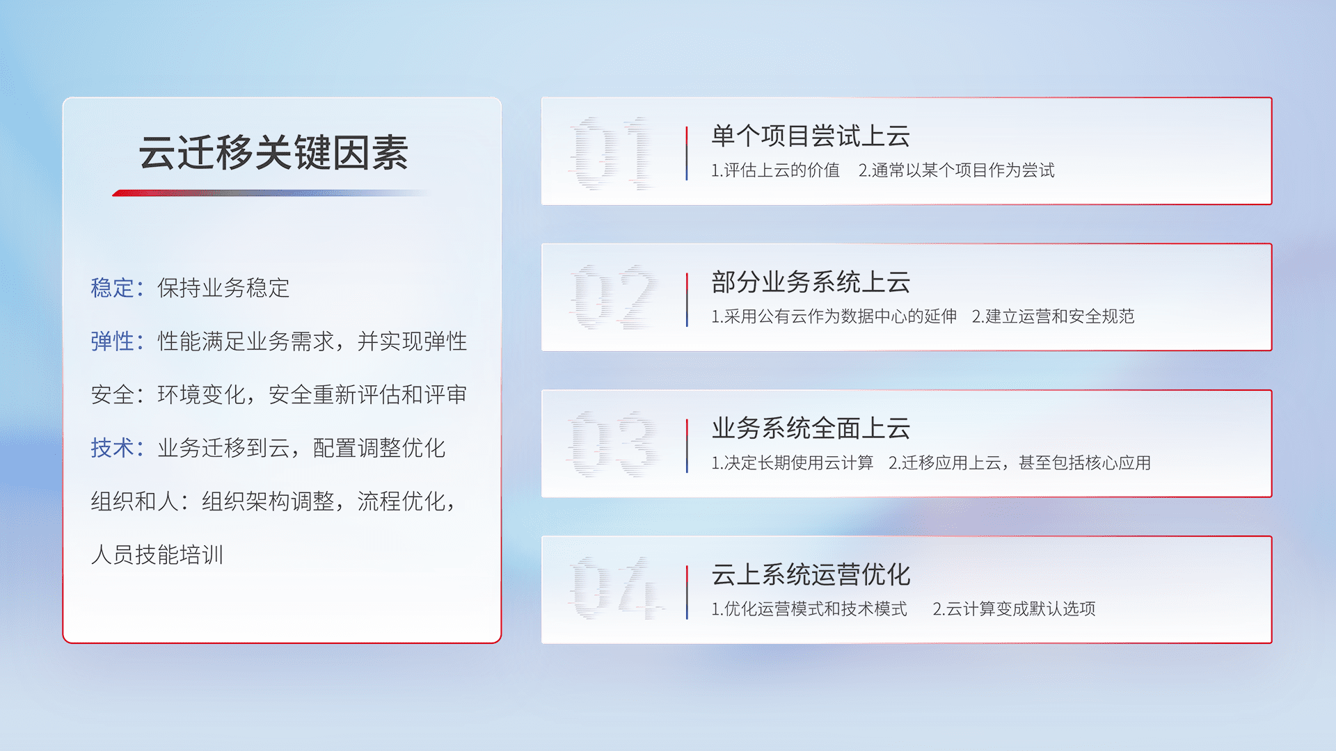 结合实际业务,,,,从规划设计、、、云平台选型、、云原生改造、、数据迁移、、、集成交付,,,,迁移全过程为客户识别最佳上云路径,,,,做好风险识别管理,,,,设计网络架构、、、身份权限、、安全审计合规、、操作审计、、、、日志审计、、、监控告警策略、、、多站点容灾设计等,,对云上基础设施进行整体规划,,,提升IT治理水平,,,,以满足弹性、、高可用、、、、高性能的需求。。